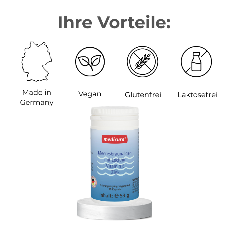 Zusammensetzung/Kapsel: Meeresbraunalgenkonzentrat (200 mg), Sojalecithin (200 mg), Kapselmaterial: HPMC, Maisstärke, DL-Alpha-Tocopherolacetat (E), Zinkgluconat, Kieselsäure, Magnesiumsalze von Speisefettsäuren, Kaliumjodid