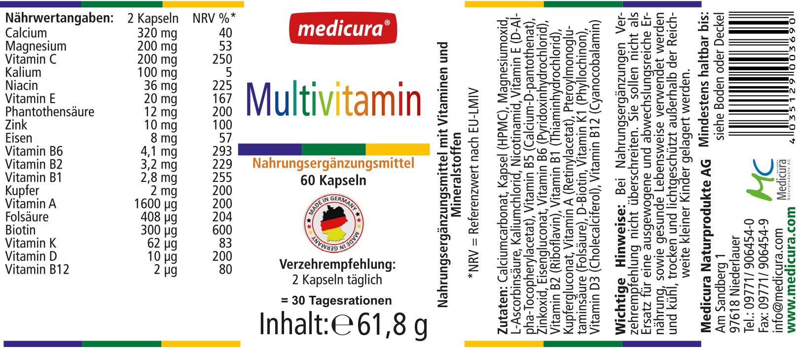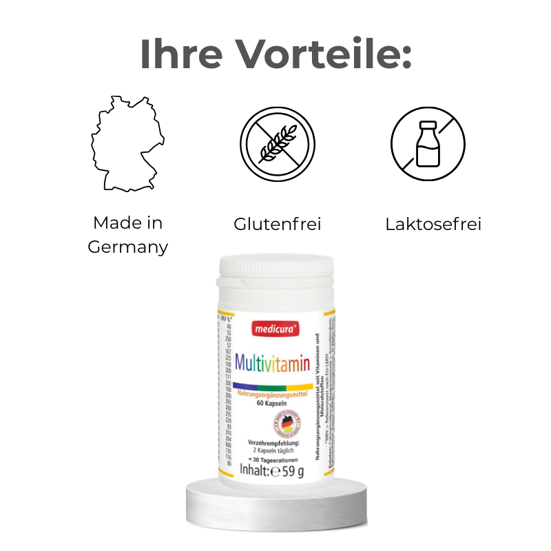 Zusammensetzung (genaue Nährwertangaben siehe Etikett/Downloads): Calciumcarbonat, Kapsel (HPMC), Magnesiumoxid, L-Ascorbinsäure, Kaliumchlorid, Nicotinamid, Vitamin E (D-Al-pha-Tocopherylacetat), Vitamin B5 (Calcium-D-pantothenat), Zinkoxid, Eisengluconat, Vitamin - B6 (Pyridoxinhydrochlorid) Vitamin B2 (Riboflavin), Vitamin B1 (Thiaminhydrochlorid) Kupfer - gluconat, Vitamin A (Retinylacetat), Pteroylmonoglutaminsäure (Folsäure), D-Biotin, Vitamin K1 (Phyllochinon), Vitamin D3 (Cholecalciferol), Vitamin B12 (Cyanocobalamin)