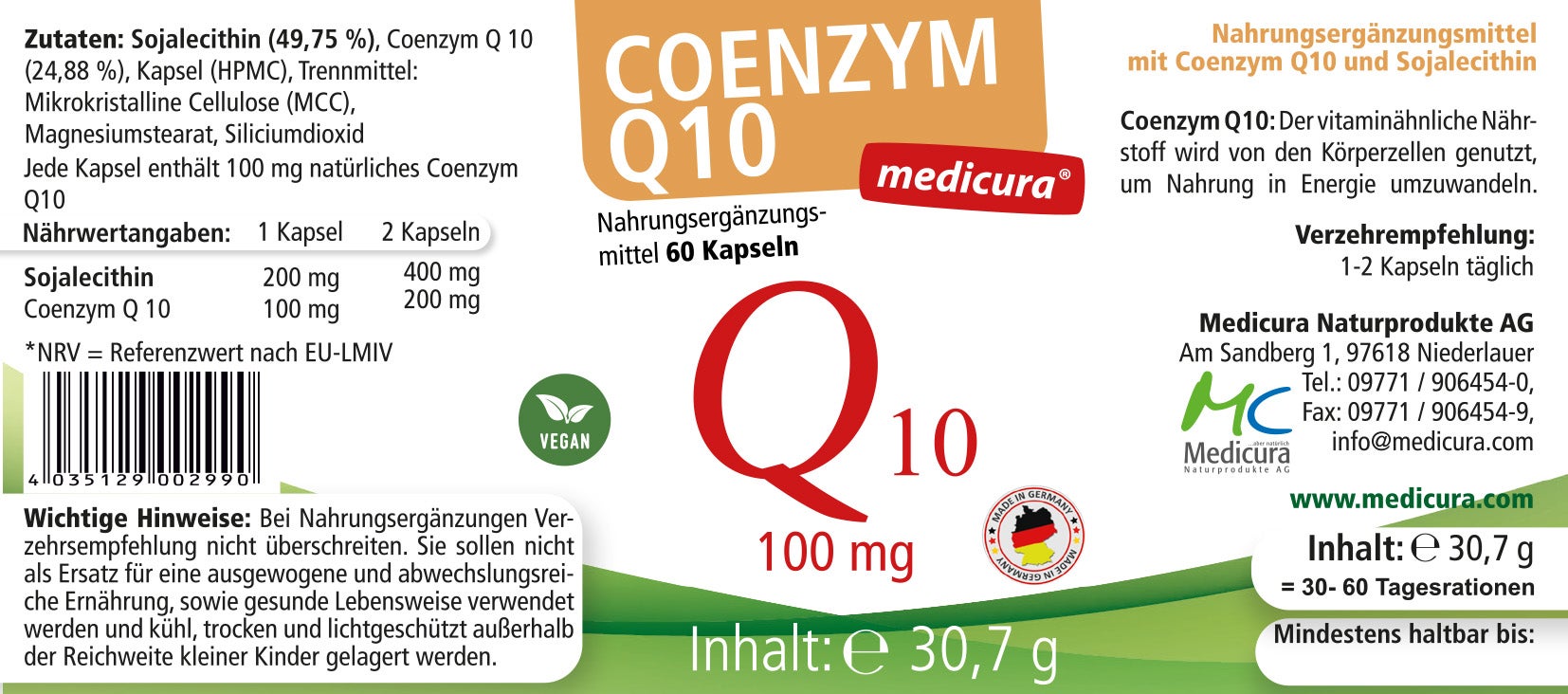 Zusammensetzung/Kapsel: Sojalecithin (49,75 %), Coenzym Q 10 (24,88 %), Kapsel (HPMC), Trennmittel: Mikrokristalline Cellulose (MCC), Magnesiumstearat, Siliciumdioxid