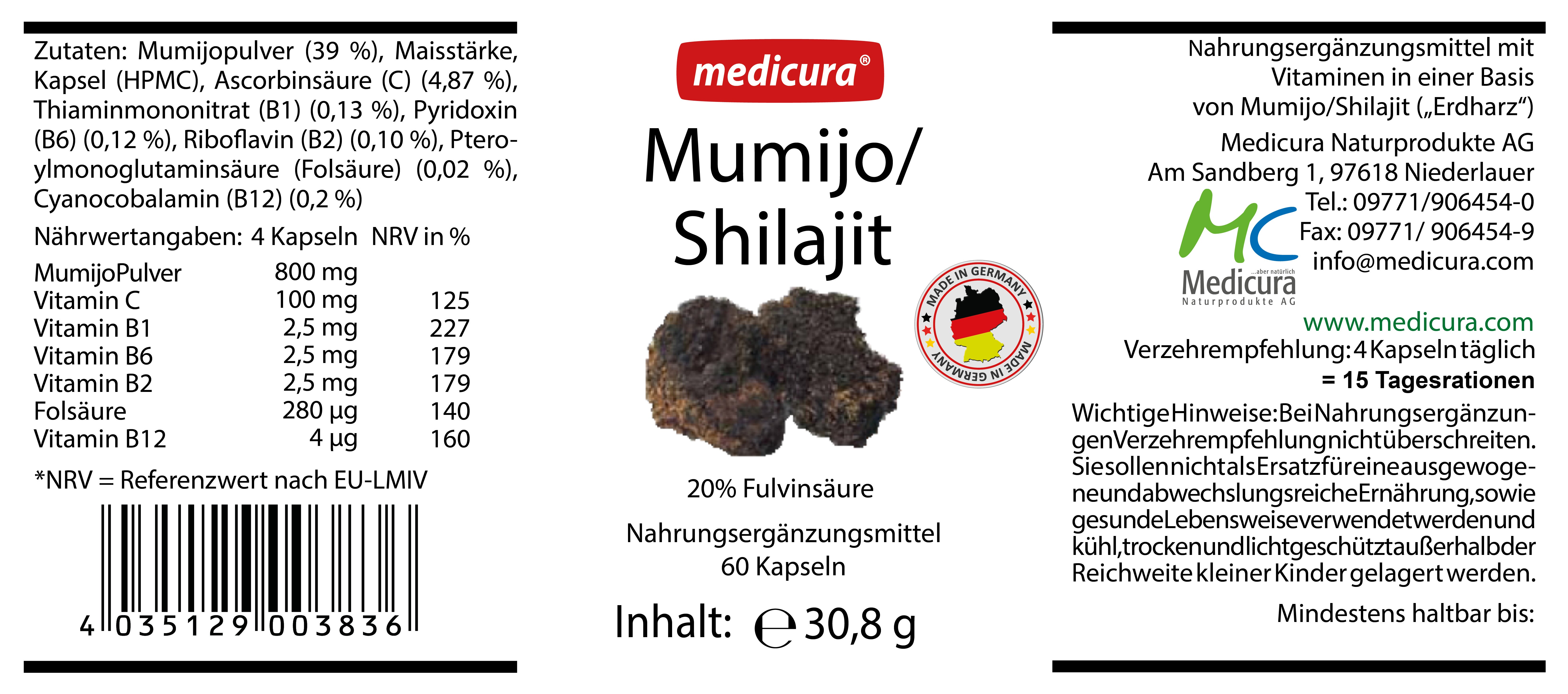 Zusammensetzung/Kapsel: Mumijopulver (39 %), Maisstärke, Kapsel (Gelatine), Ascorbinsäure (C) (4,87 %), Thiaminmononitrat (B1) (0,13 %), Pyridoxin (B6) (0,12 %), Riboflavin (B2) (0,10 %), Pteroylmonoglutaminsäure (Folsäure) (0,02%), Cyanocobalamin (B12) (0,2%)